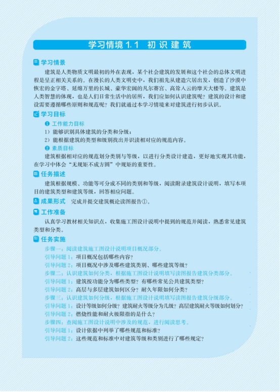 本教材共设计了20个学习情境活页,通过情境导入和详细的操作步骤弓|领学生进入到真实工作任务中来,在“做”中将理论知识点转换为实践应用,进一步加强对施工图纸的认识。