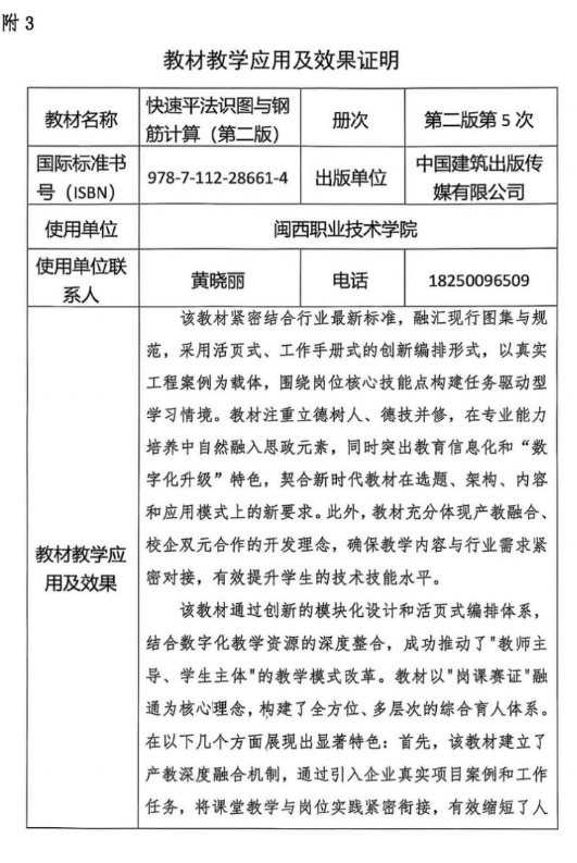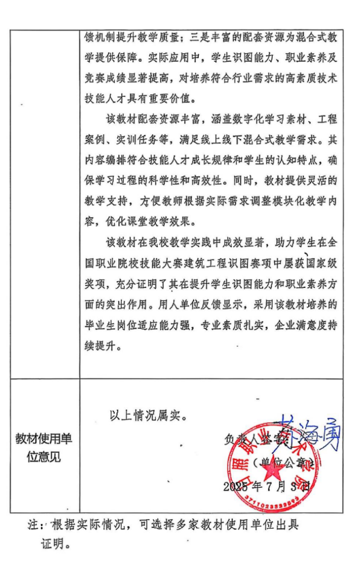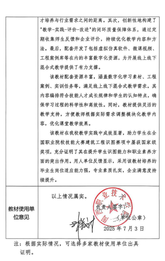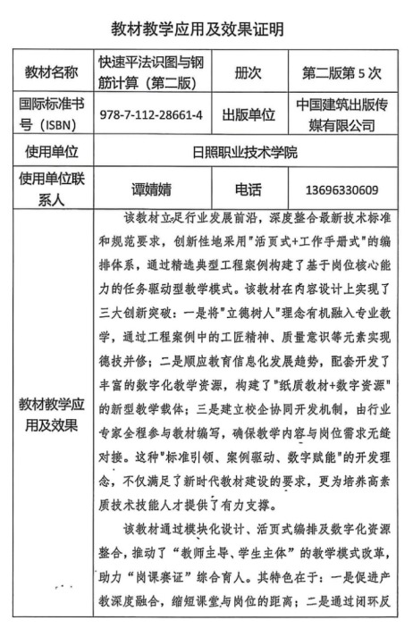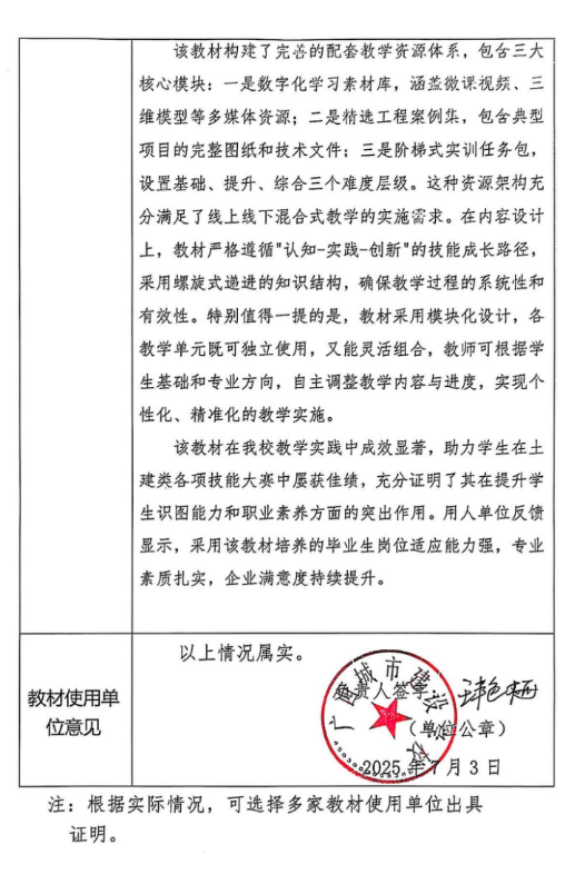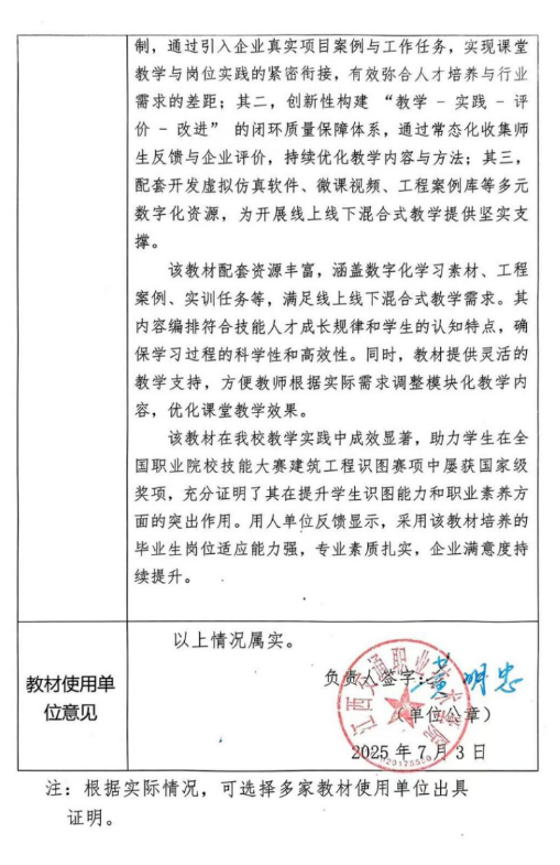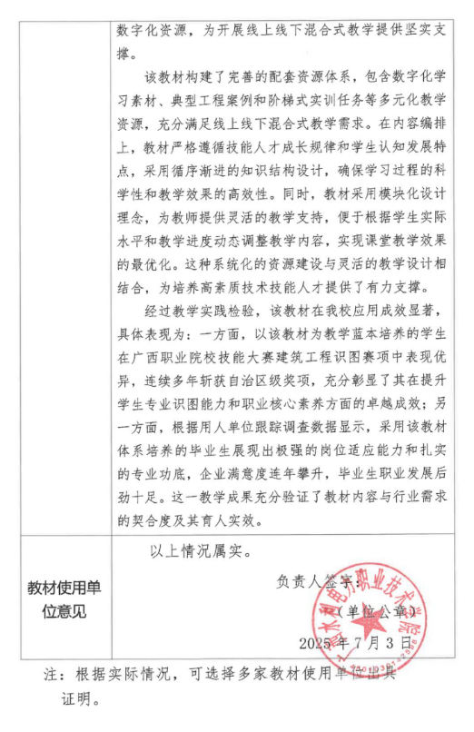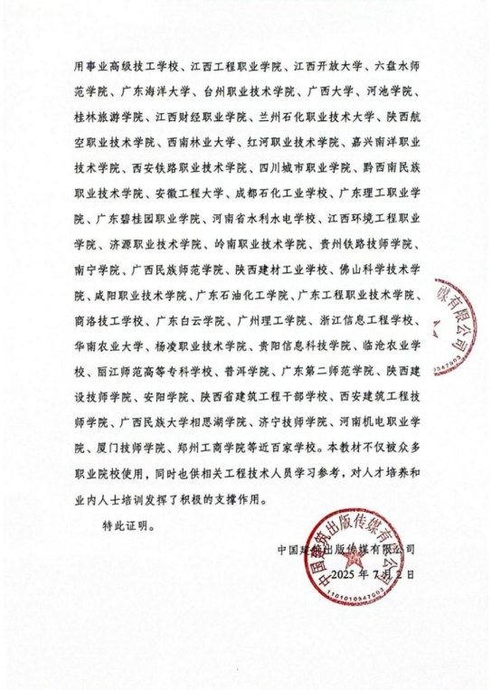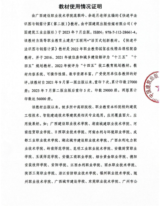 教材被多所中高职院校、职业教育本科院校的od平台官方官网工程技术、智能建造技术等od平台官方官网类相关专业选用,应用覆盖面大,应用效果好。如:日照职业技术学院、江西交通职业技术学院、广西水利电力职业技术学院、广西城市建设学校、闽西职业技术学院等。