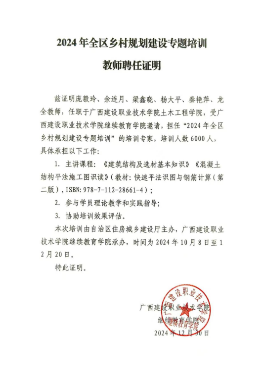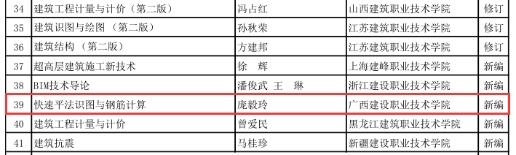 在2020年广西职业院校教学能力大赛高职组微课教学比赛中,参赛作品《柱纵筋插入基础中的构造与计算》荣获二等奖 | 在2019年广西职业院校教学能力大赛高职组微课教学赛项比赛中,参赛作品《悬挑梁纵筋的构造与计算》荣获二等奖 |