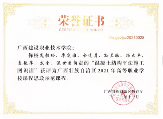《知行合一、精益求“筋”——梁的钢筋种类介绍与钢筋骨架制作》获2019年广西职业院校教师教学能力大赛高职组课堂教学比赛一等奖 | 《梁集中标注》微课荣获2017第十七届广西高校教育教学信息化大赛一等奖 |