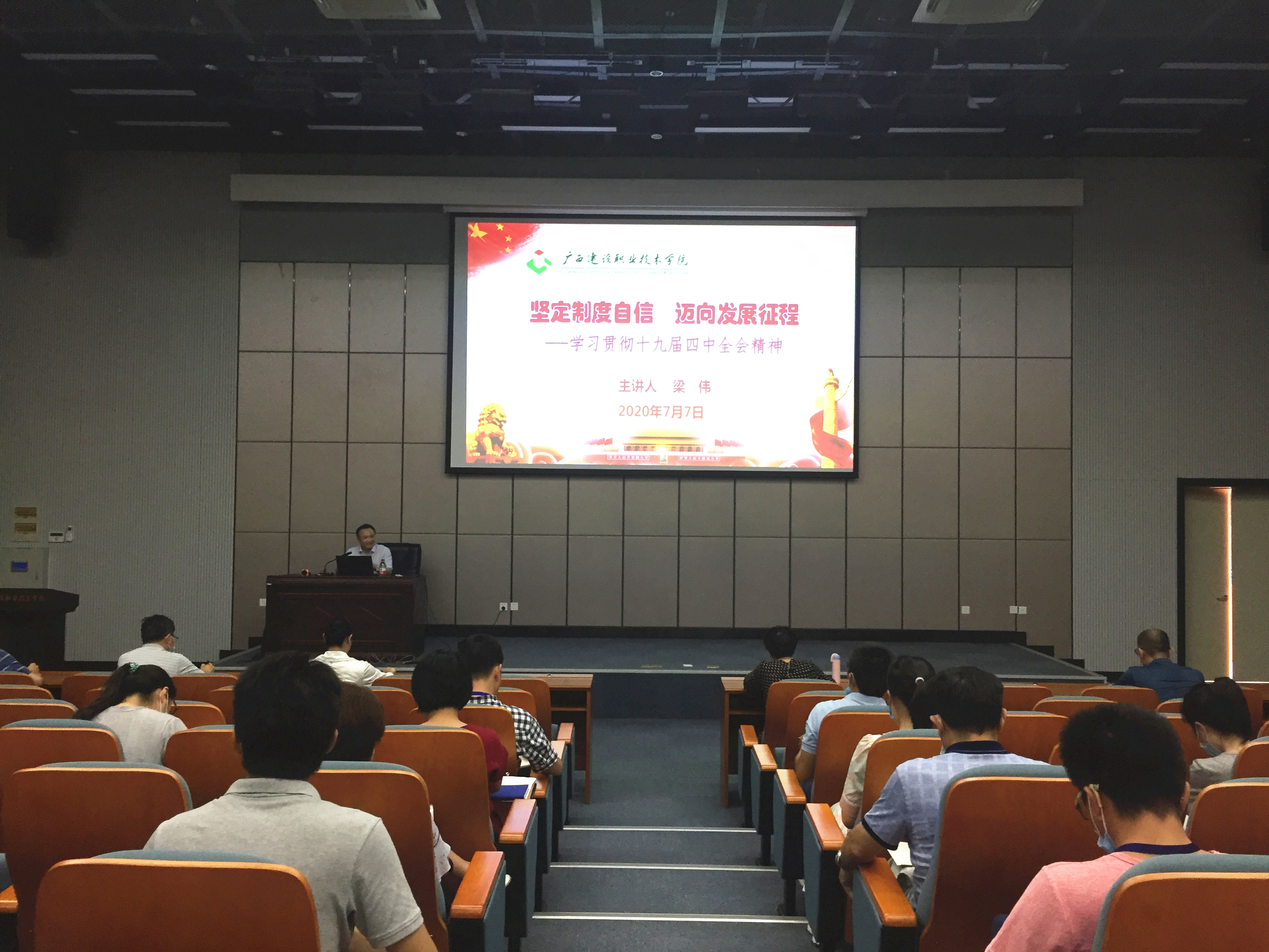 广西建院7月14日讯(艺术设计系 陈昕)为进一步深入学习贯彻习近平新时代中国特色社会主义思想和党的十九届四中全会精神,7月7日下午,学院梁伟副院长讲授了《坚定制度自信,迈向发展征程——学习贯彻十九届四中全会...