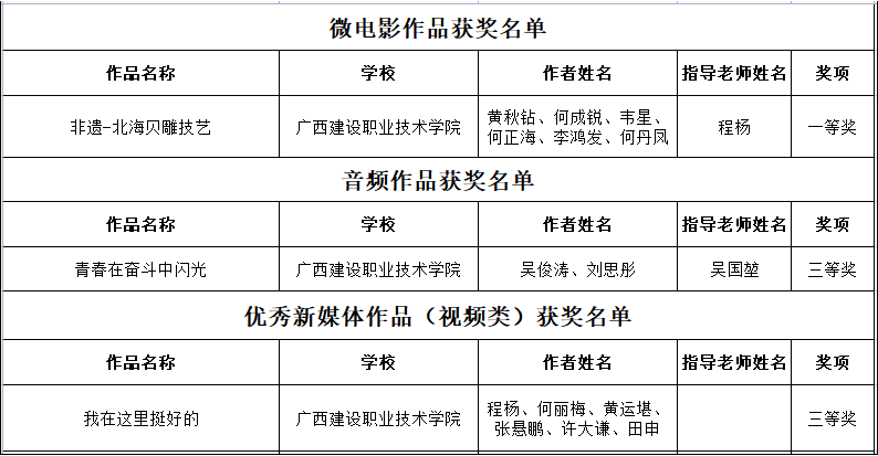广西建院11月1日讯(党委学生工作部 刘晗蓓)近日,自治区教育厅、自治区党委网信办印发《关于公布第八届全区大学生网络文化节和2022年全区高校网络教育优秀作品推选展示活动获奖名单的通知》(桂教思政〔2022〕...