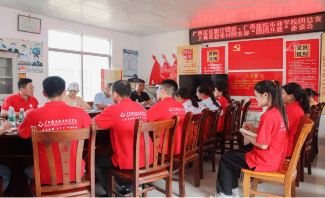 广西建院7月18日讯(市政与交通学院 杨铄 黄晶晶 覃小怡)近日,广西住房城乡建设厅团委(简称“厅团委”)、广西建院市政学院团总支、上林县赵坐村团支部“团团共建”座谈会暨广西建院“暑期‘三下乡’社会实践基地”揭牌仪式在上林县赵坐村举行,厅团委书记姚磊,广西建院市政学院党总支副书记(主持工作)刘海彬,广西建院市政学院团总支副书记、观察团带队老师杨铄,赵坐村驻村第一书记申建立等参加座谈会并为实践基地揭牌。广西建院“...