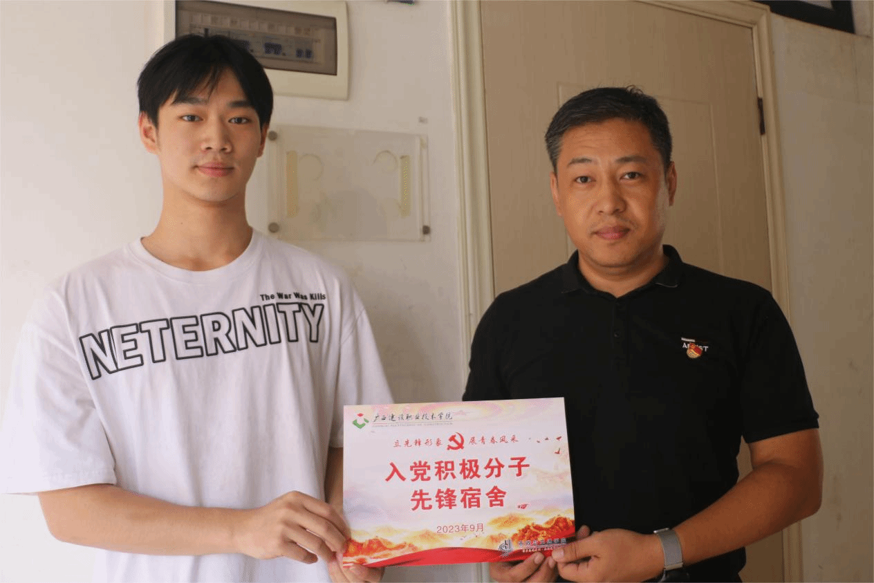 广西建院9月26日讯(市政与交通学院 刘晗蕾)为进一步强化“一站式”学生社区综合管理模式建设,充分发挥学生党员、入党积极分子模范带头作用,市政与交通学院学生公寓党建工作室于9月26日举行了学生党员、入党积极分子先锋宿舍挂牌仪式。市政与交通学院党总支副书记刘海彬,全体辅导、学管老师和市政与交通学院学生党员、入党积极分子代表参加仪式。刘海彬副书记代表市政与交通学院党总支对挂牌的党员、入党积极分子宿舍和个人表示热烈祝贺。...
