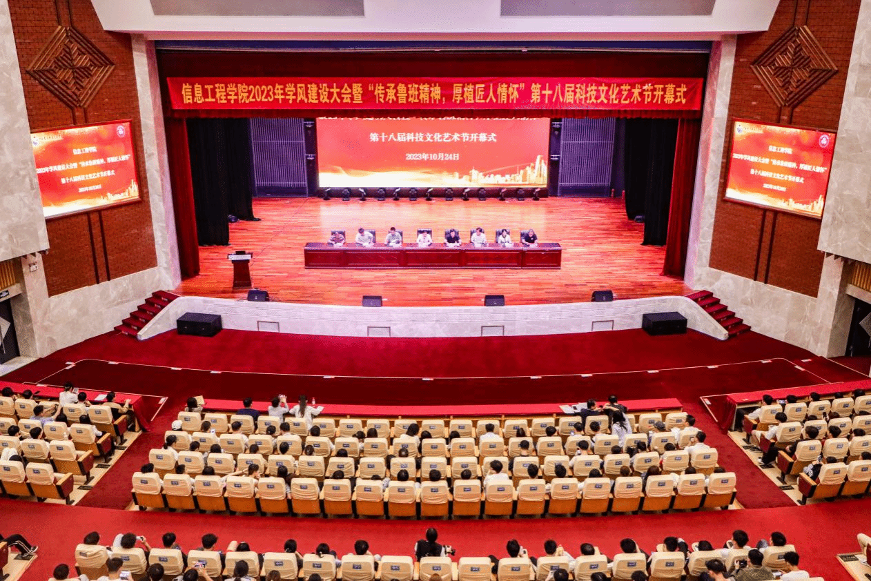 广西建院10月25日讯(信息工程学院 徐田保)为进一步总结学风建设经验,宣传先进典型,夯实育人阵地,10月24日,信息工程学院在学校礼堂召开信息工程学院2023年学风建设大会暨“传承鲁班精神,厚植匠人情怀”第十八届科技文化艺术节开幕式。信息工程学院领导班子,全体教师、校企教师,2022级、2023级学生代表等900余人参加。会议由学院副院长覃一海主持。大会在庄严肃穆的国歌声中拉开序幕。会上,学院领导向获得第九届中国国际“互联网+...