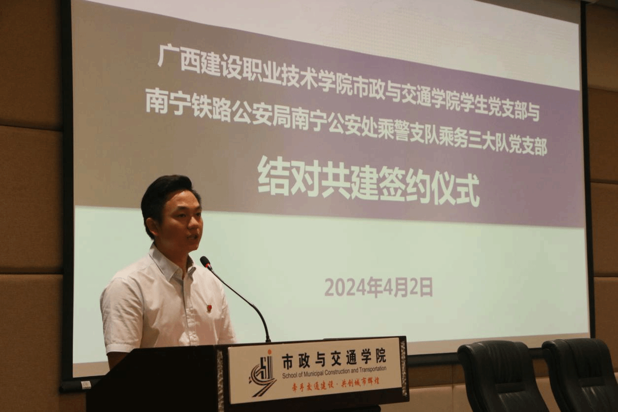 广西建院4月3日讯(市政与交通学院 文/刘雪妮 图/高杨杨)为进一步探索党建共建新思路,营造风清气正校园文化氛围,4月2日下午,市政与交通学院学生党支部与南宁铁路公安局南宁公安处乘警支队乘务三大队党支部在学校学术报告厅举行了党建结对共建签约仪式暨反诈安全进校园宣讲活动。市政与交通学院党总支统战委员、团总支书记何炎,南宁铁路公安处乘警支队三大队大队长杨吉波,教导员蔡永鹏,三级警长蔡文博、高腾,市政与交通学院学生党支部全体党员、...