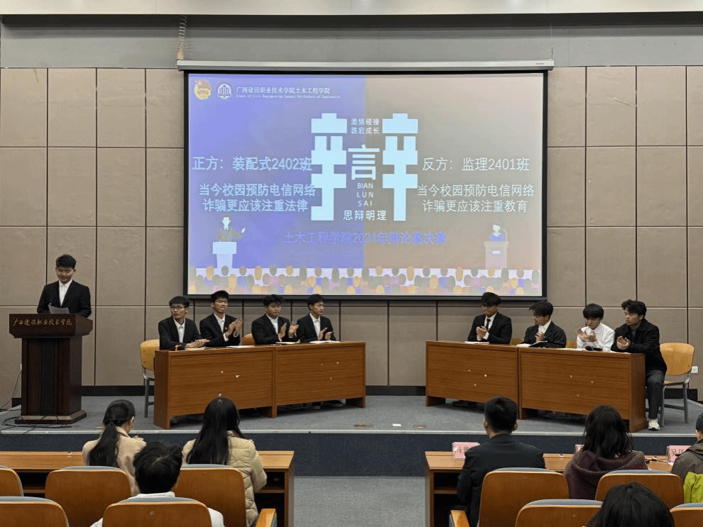 广西建院12月31日讯(土木工程学院 文/石明成 谭妍 图/吴海平 梁建新 张春毅)12月30日,土木工程学院在6教3楼会议室举行2024年辩论赛决赛。此次活动聚焦“提升电信网络诈骗防范意识”主题,深入探讨法律与教育在预防校园诈骗中的核心作用。学院团总支书记冯光帆,辅导员代表,学生代表共158人参加活动。本次辩论赛历经初赛激烈角逐,18支队伍中脱颖而出4强,于决赛舞台再燃战火。决赛围绕“校园预防电信网络诈骗:法律与教育,何者更应成为重心?...