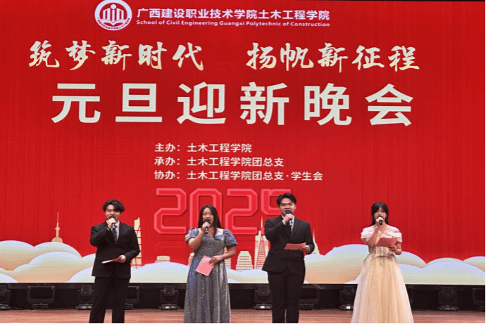 广西建院12月29日讯(土木工程学院 文/石明成 苏艳玲 图/赵子丞 黄明烨 张伟)近日,土木工程学院在学校礼堂举行了“筑梦新时代,扬帆新征程”2025年元旦迎新晚会。学院党总支书记孔祥刚,副院长谢华、葛春雷,团总支书记冯光帆,全体学管干事、辅导员及2024级新生参加晚会。本场晚会以“筑梦新时代,扬帆新征程”为主题,由舞狮协会、大学生艺术团、大学生合唱团、土木艺术团、音乐爱好者协会、街舞爱好者协会等学生组织带来的舞蹈、...