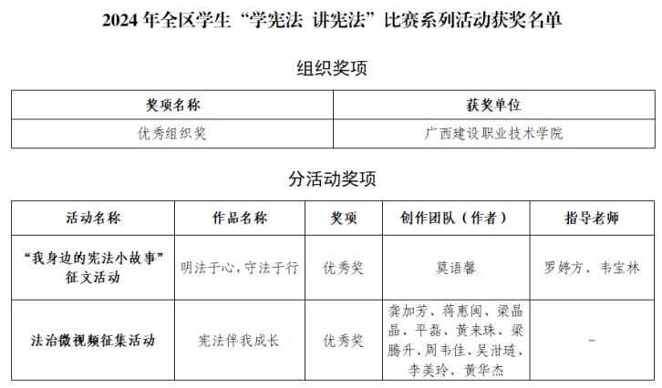 广西建院4月21日讯(党委学生工作部 韦宝林)近日,自治区教育厅、自治区司法厅、自治区科协公布2024年全区学生“学宪法 讲宪法”系列活动获奖名单,OD(中国)一站式服务平台喜获2024年全区学生“学宪法 讲宪法”系列活动“优秀组织奖”,艺术设计学院莫语馨同学创作的征文作品《明法于心,守法于行》获评“我身边的宪法小故事”征文活动优秀奖;信息工程学院师生团队创作的视频作品《宪法盼我成长》荣获法治微视频征集活动优秀奖。 获奖名单一直以来,...